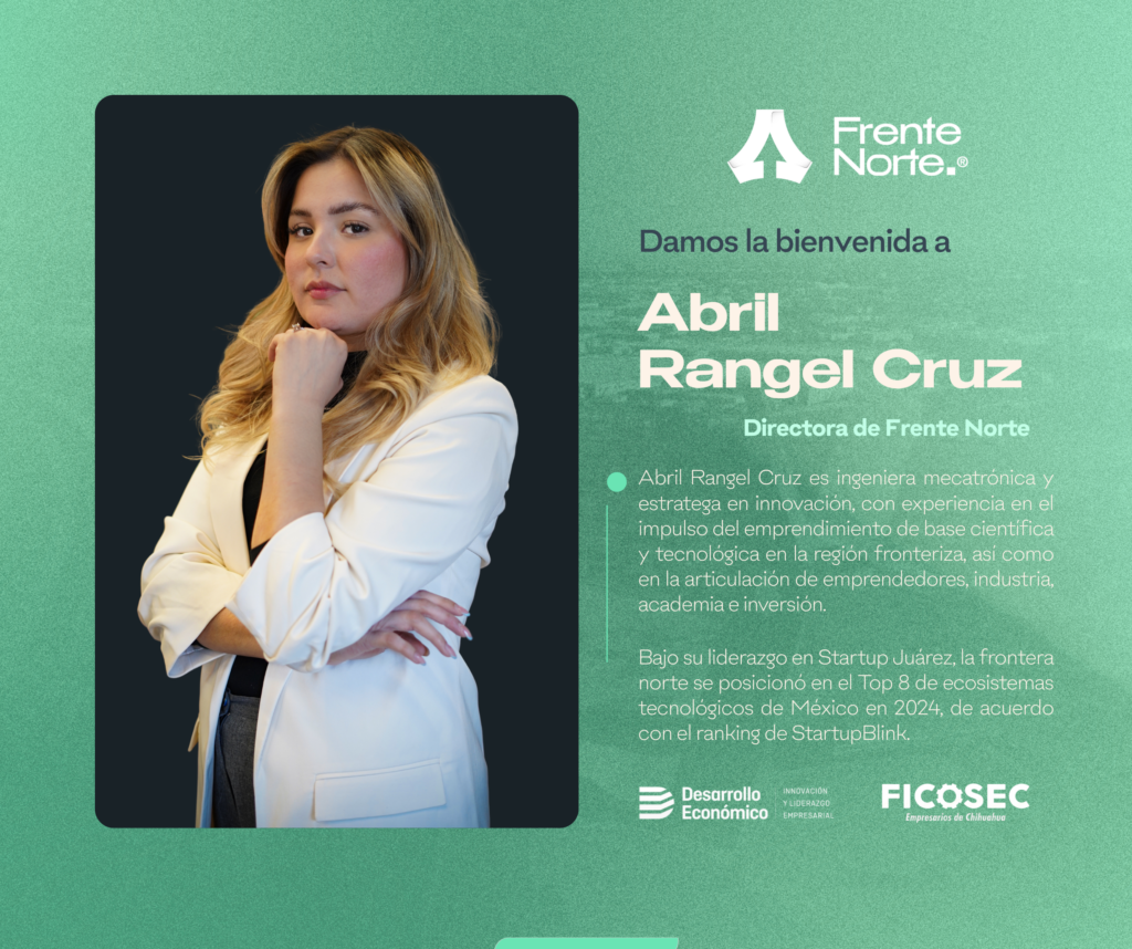 A partir de este proceso, Abril Rangel Cruz asume la Dirección de Frente Norte, dando seguimiento a la misión, visión y líneas estratégicas de la Estrategia de Especialización Inteligente de Ciudad Juárez, así como a las acciones enfocadas en la innovación, la competitividad y la articulación del ecosistema regional.